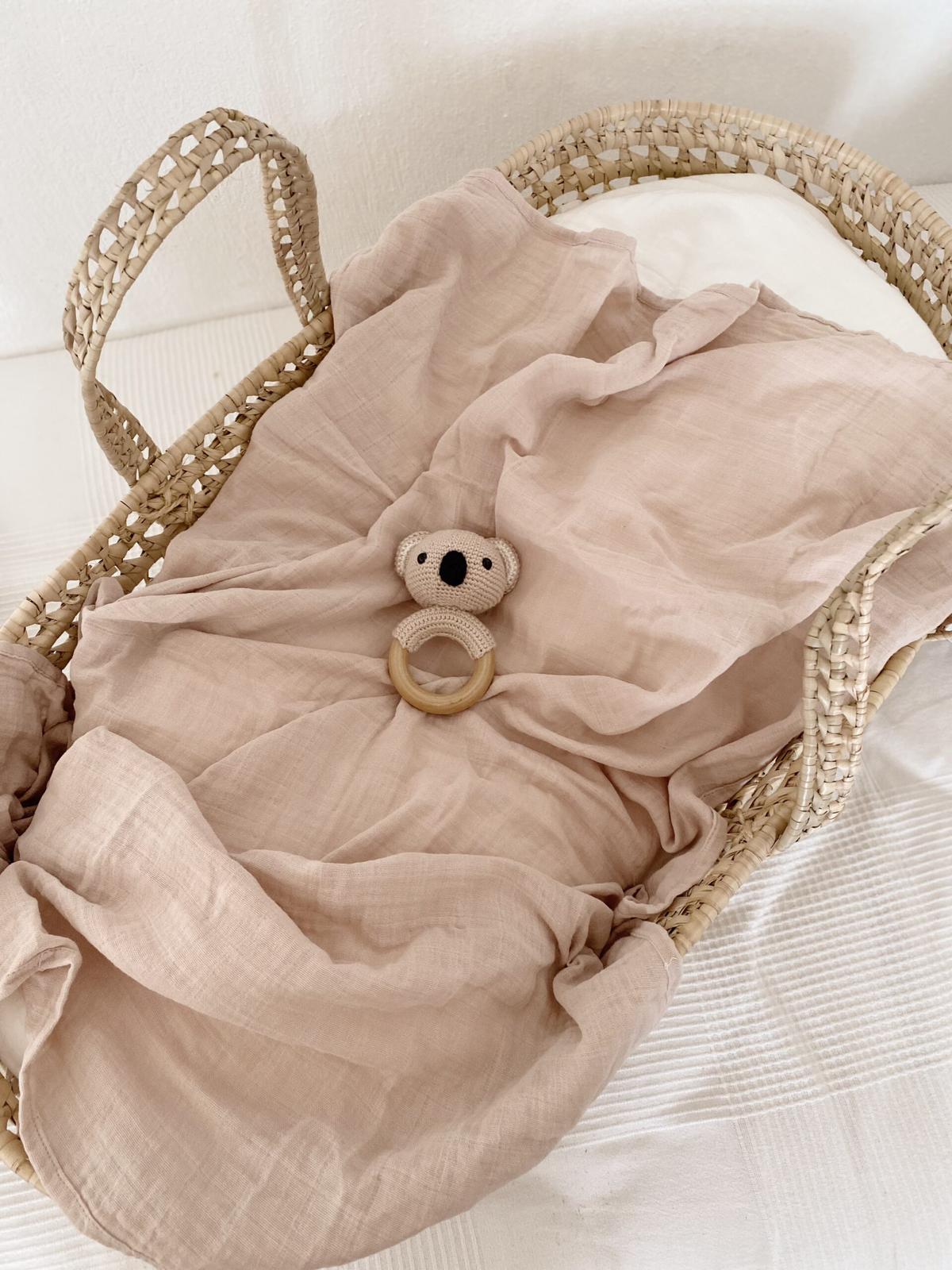 Denna mjuka muslinfilt är perfekt för din lilla älsklings komfort. Tillverkad av ett lätt och luftigt tyg ger den en mysig och skonsam känsla för bebisar. Perfekt för invigning, gos eller som barnvagnsskydd – denna mångsidiga filt är ett oumbärligt tillskott i varje barnrum. Den mjuka texturen och den enkla designen gör den till en tidlös del av din bebis basgarderob.