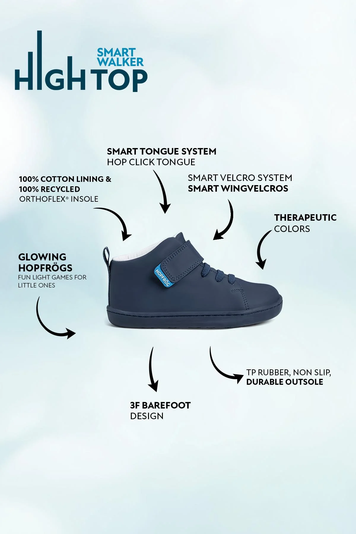 Utrustad med Hopfrögs innovativa Smart WingVelcros, kan även de minsta enkelt ta på och av skorna själva. Den elastiska och flexibla kardborren ger jämnt grepp utan att klämma, och håller skorna säkert på plats.