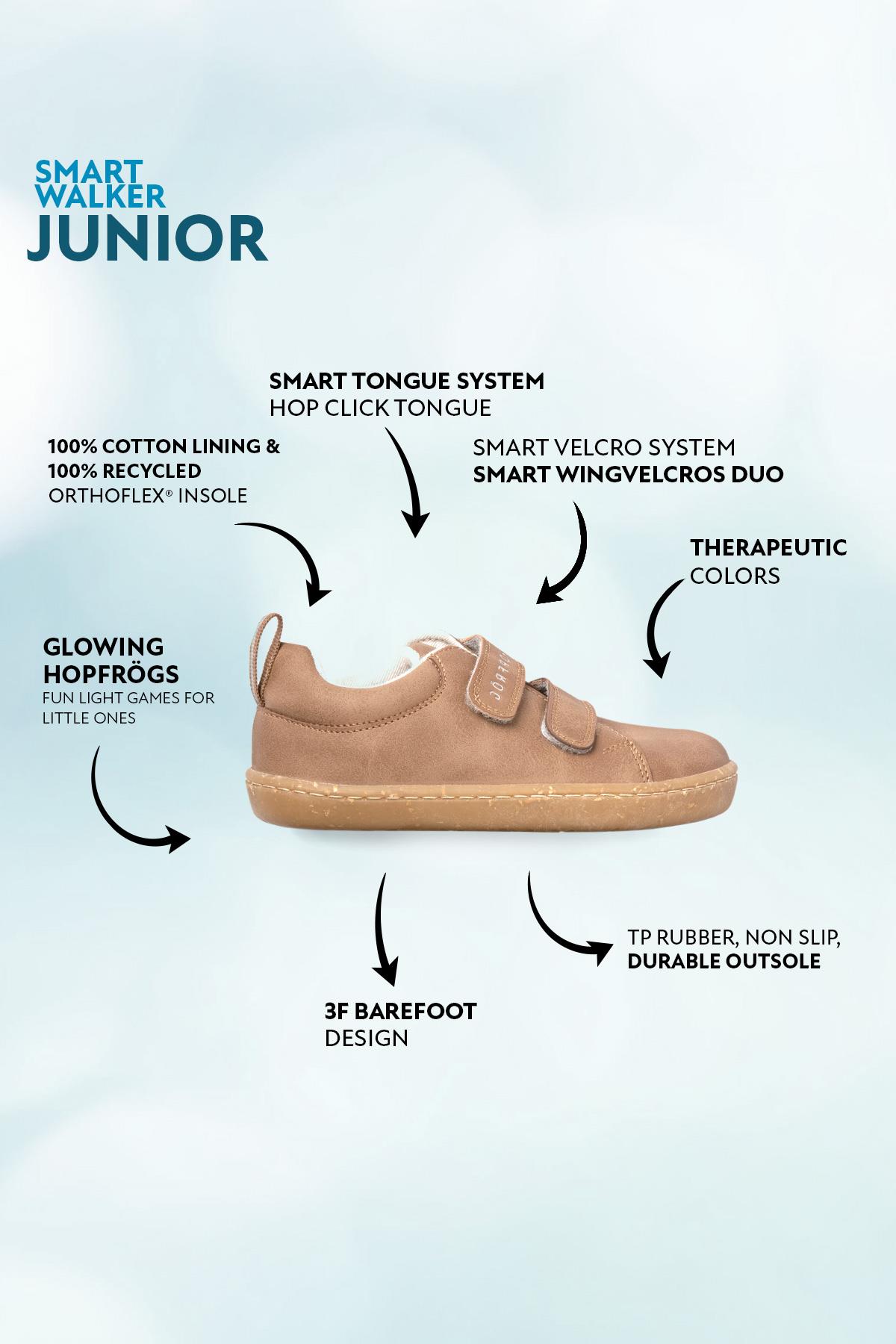 Smart Walker Junior kombinerar modern design med maximal komfort och stöd för barns naturliga fotutveckling. Med mjukt ankelgrepp och balanserad dämpning fördelas trycket jämnt över foten. Skon är utrustad med Hop-Click Tongue – enkel att ta på då framstycket hålls på plats med ett smart låssystem som förhindrar att den viker sig eller glider in i skon. När den lyfts upp stannar den kvar, vilket skapar extra utrymme och gör skon enkel för barnet att ta på själv. Perfekt för lek, vardag och äventyr, med stil och kvalitet i varje steg.