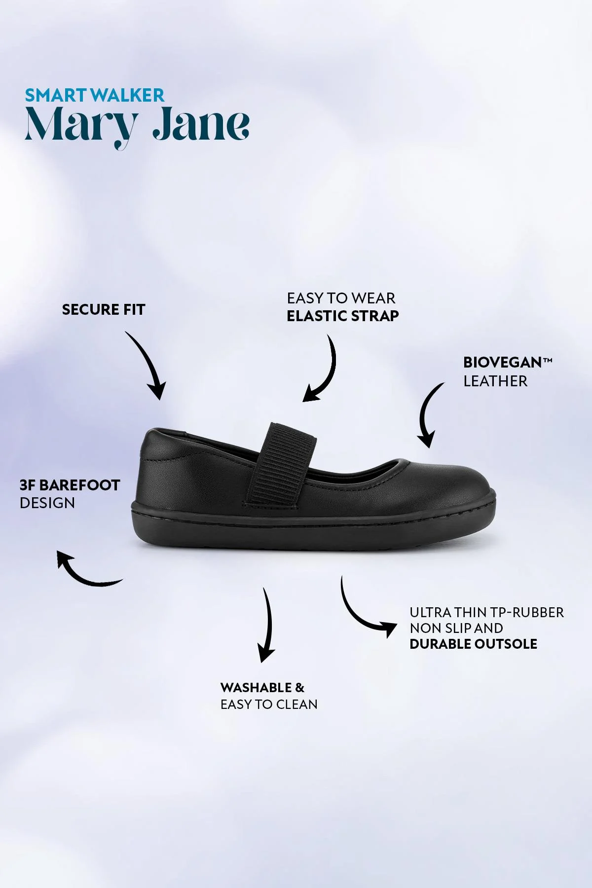 Dessa barfotaskor i BioVegan™-läder låter små fötter glänsa samtidigt som de får full rörelsefrihet. Den elastiska remmen gör dem enkla att ta på och håller skon på plats hela dagen. Med sin flexibla sula och mjuka passform stödjer de barnets naturliga steg – perfekta för både fest och vardag.