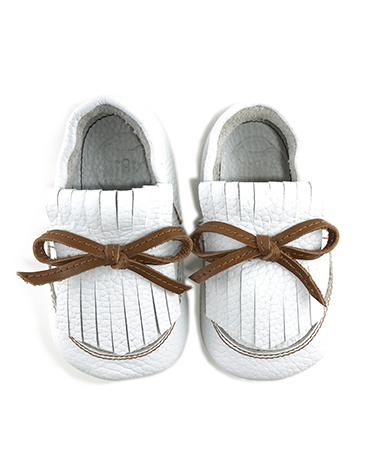 Moca Gentle har charmiga detaljer, inklusive en liten rosett i en kontrasterande färg och fransar mitt på skon. Med en läderutsida är den lätt att rengöra vid behov.